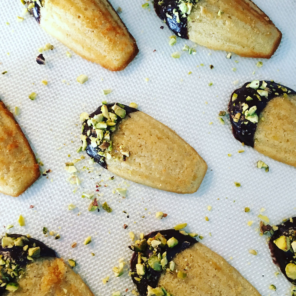 Fluffy Lemon Madeleines dipped in Dark chocolate ganache and crumbled pistachios